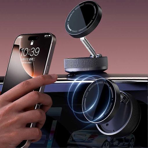 Haz tus trayectos más cómodos y seguros con el soporte magnético para teléfono con ventosa al vacío 📱. Diseñado para fijarse firmemente en el salpicadero del coche, ofrece una sujeción estable incluso en curvas cerradas o frenadas bruscas, manteniendo el móvil siempre a la vista sin comprometer la seguridad.
